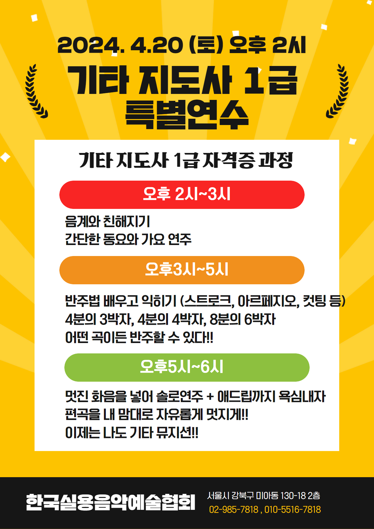 | 우쿨렐레지도사 1급 자격증 과정 개인레슨 특별연수안내 (한국우쿨렐레지도사협회) (0) | 2024.03.05 |