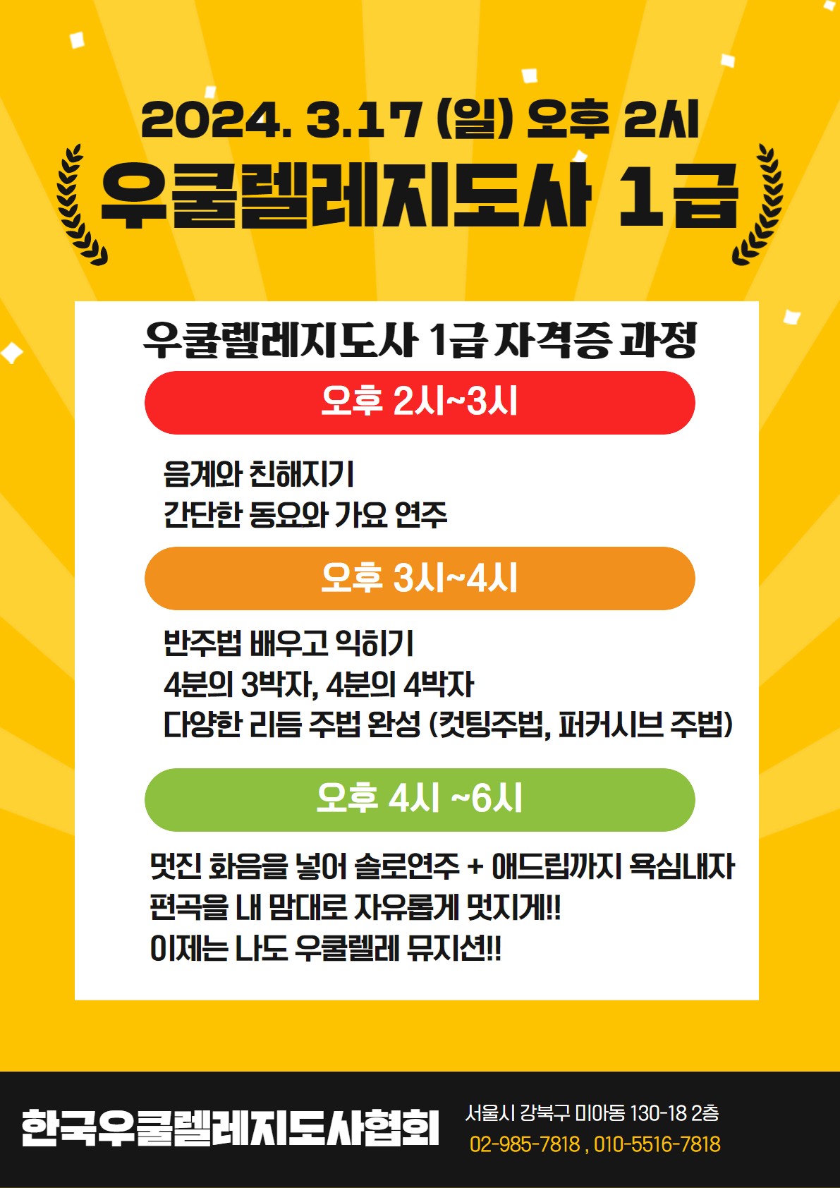 | 우쿨렐레지도사 1급 자격증 과정 개인레슨 특별연수 안내 (한국우쿨렐레지도사협회) (0) | 2024.02.16 |